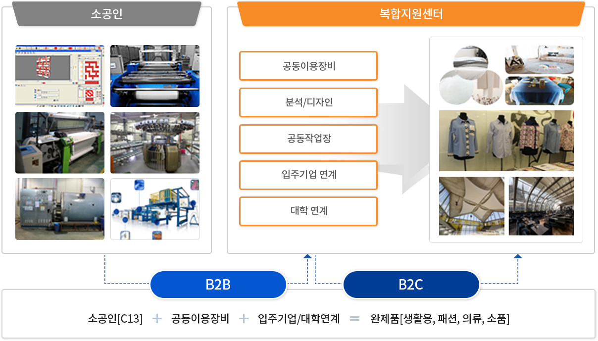 급변하는 섬유산업 환경에 적합하도록 지원정책 및 활성화 목표수립과 공주시가 핵심사업으로 집중적 지원 연계할 수 있는 프로그램으로 소공인복합지원센터는 집적지 인근의 소기업이 인원의 한계로 지원 인프라를 이용하기 어려웠던 문제를 상당부분 해소할 수 있어 빠른 제품개발 및 품질 안정화가 가능해져 바이어의 신뢰성 향상 시킬 수 있습니다.