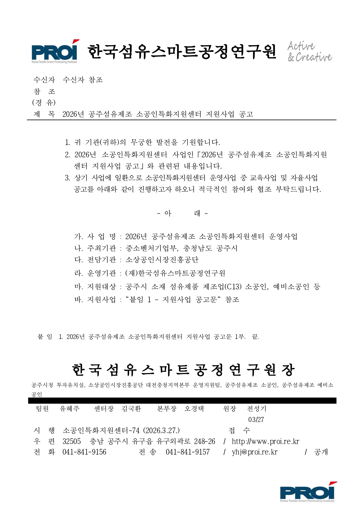 안녕하세요. 공주섬유제조 소공인특화지원센터입니다. (사업공고문)2026년 공주섬유제조 소공인특화지원센터 지원사업 공고문 지원사업 신청 기간은 4월 10일까지입니다. 첨부파일을 확인하시고, 해당되는 사업에 신청해 주시기 바랍니다. 궁금하신 사항이 있으시면 연락 주시기 바랍니다. 감사합니다. 041-841-9160 공주섬유제조 소공인특화센터 |